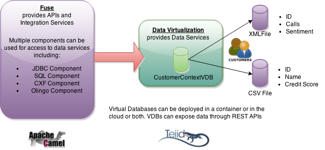 Cojan van Ballegooijen, Red Hat Senior Solution Architect, Bill Kemp, Red Hat Senior Solution Architect, and myself have created an example around a Customer Context Use Case to show how to use the Camel Components in Fuse to access a Data Virtualization Virtual Database (VDB). The data service provides the customer context which is aggregated data from a XML file and CSV file. The data on each customer provides the name, the credit score, the number of calls the customer has placed to customer support and the sentiment (Hot, Cold, Warm) toward the company from social media. We will review the components and show how to run the demo. The demo repository is located in jbossdemocentral on github. In our project directory we have the individual use cases which are built and deployed when running the scripts. The Teiid jdbc jar is loaded into the profile with wrap file during the run script.